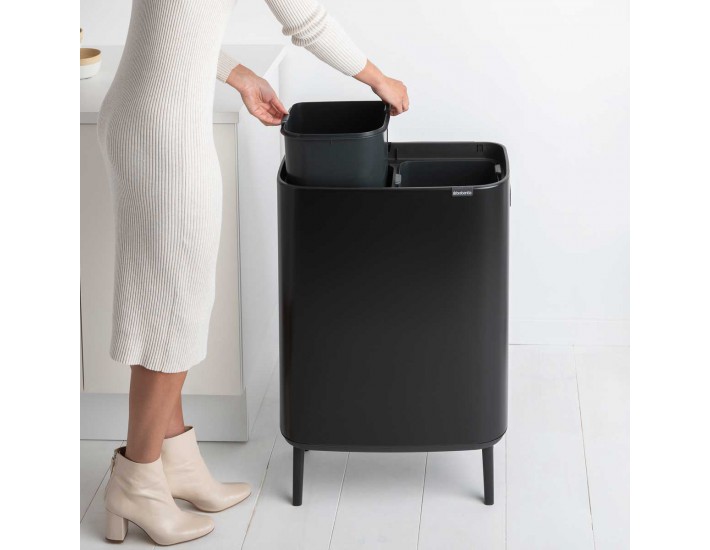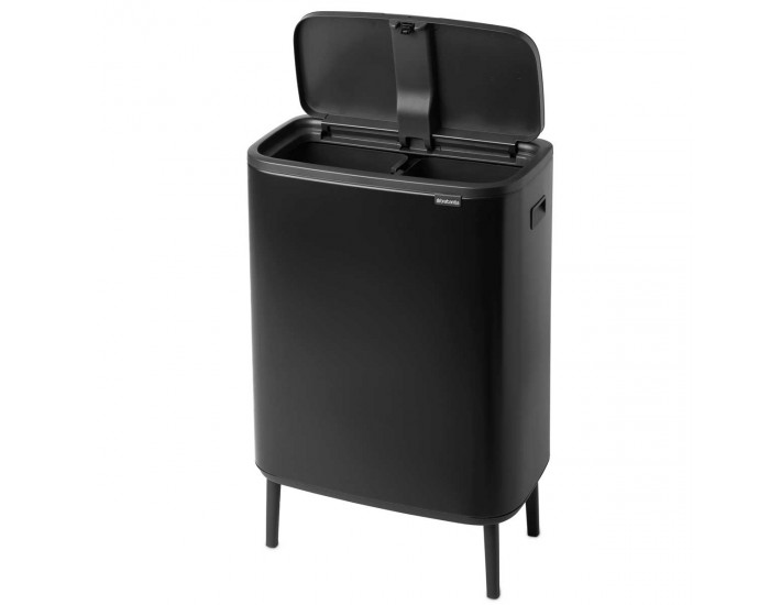 BO טאץ פח הפרדה 30+30 ליטר, שחור מט Brabantia – פח הפרדה יפה ויוקרתי – 60 ליטר של עיצוב מרהיב – כן, ממש רהיט של פח עם רגליים ושני תאים נפרדים להפרדת אשפה אורגנית ומיחזור