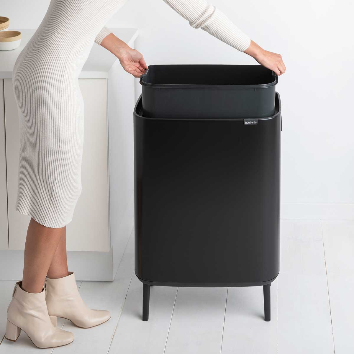 פח BO בגוון השחור המט מתאים בצורה מושלמת למטבחים מודרניים ומסוגננים. הגב השטוח מאפשר לו להיצמד בצורה חכמה לקיר, תוך ניצול מיטבי של השטח במטבח ושמירה על מראה מסודר. הרגליים המתכווננות מאפשרות התאמה מושלמת לכל משטח, ומבטיחות יציבות מקסימלית.