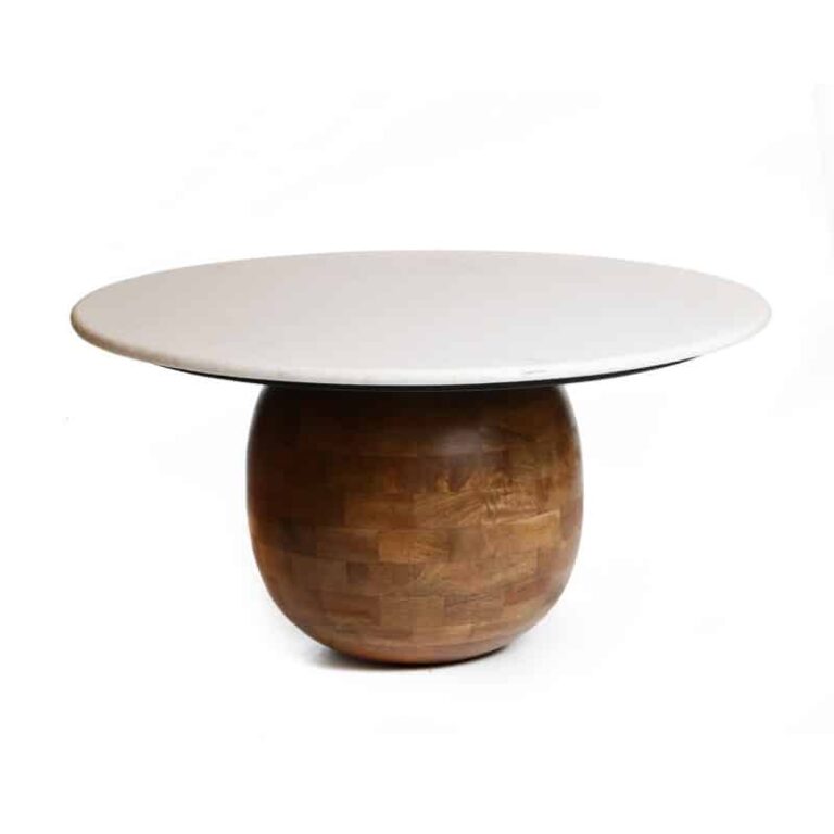 שולחן שיש לבן עגול (2 חל’) רגל עץ כדורית קוטר 80 גובה 40 ס”מ