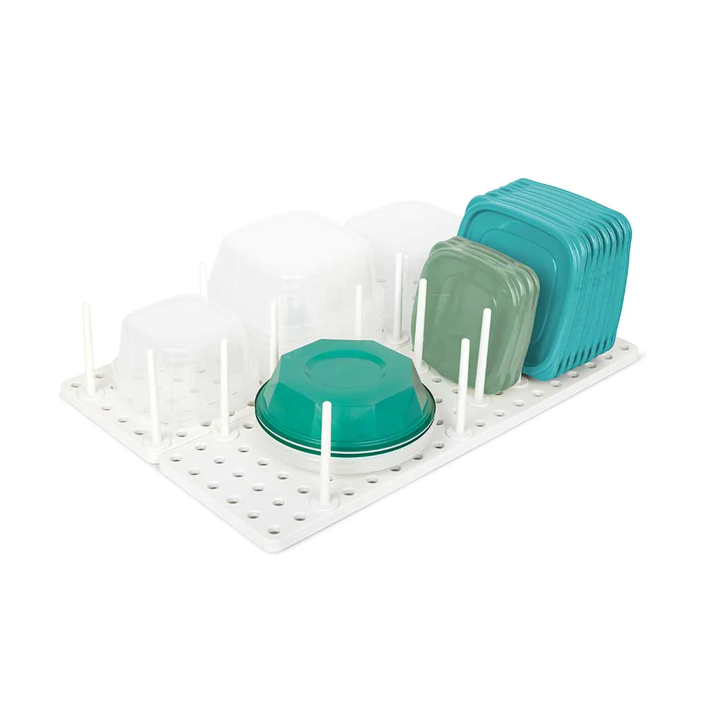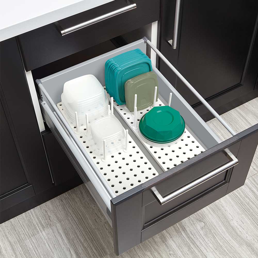 ארגונית למגירה הבנויה מ- 2 מגשים מתכווננים ויתדות אשר ניתן להסיר ולמקם מחדש בכל עת. ניתן לבחור היכן למקם אותם על סמך הצרכים שלכם, מה שאומר שאתם יכולים ליצור את ההתאמה המושלמת לכלי הבישול, קופסאות האחסון שלכם ועוד. המגש בנוי עם 16 יתדות כלולים, מה שאומר אפשרויות אחסון כמעט בלתי מוגבלות.