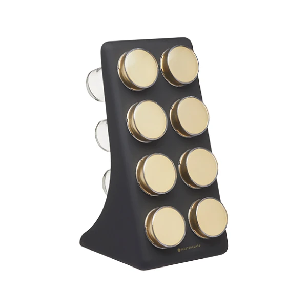 המעמד כולל שמונה צנצנות עם מכסים בגימור פליז המספקים את העיצוב והפונקציה, ומאפשרים גישה נוחה ללא טרחה לתבלינים כשתזדקקו להם.