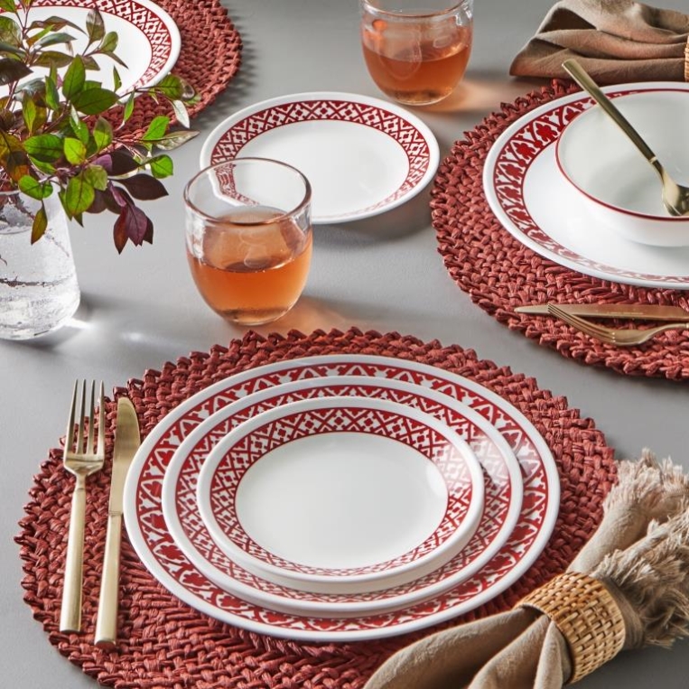 דגם ונציאני משלב שוליים אדומים עבים, על רקע לבן נקי ויוצר ניגודיות משלימה. דגם מודרני ואלגנטי המתאים למגוון סגנונות עיצוביים. הסט משלב את אותה הדוגמא בגודל שונה, בין המנה העיקרית לראשונה. הסט מתאים הן לשימוש יומיומי והן לאירוח חגיגי.