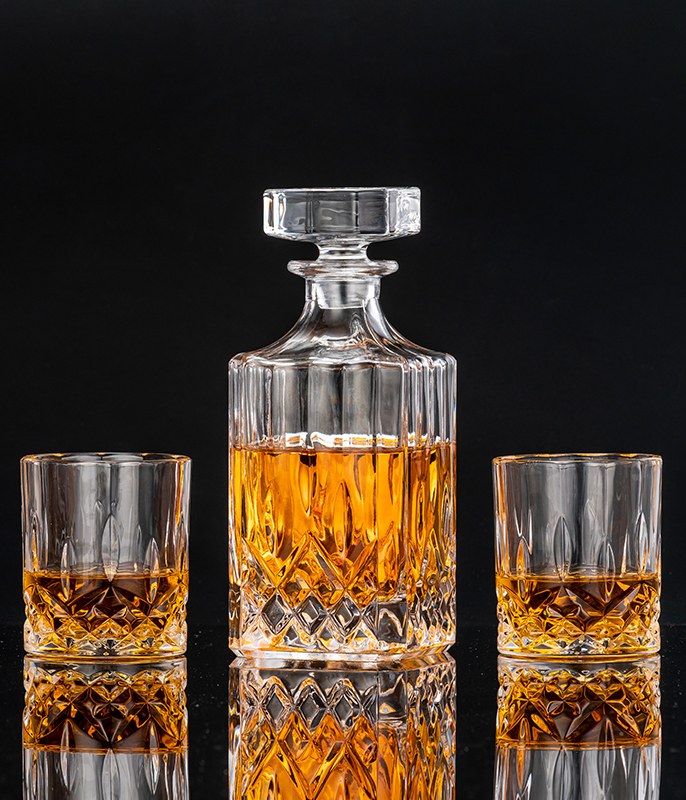 סט 3 כוסות ויסקי מעוטרות + בקבוק זכוכית מעוטר
