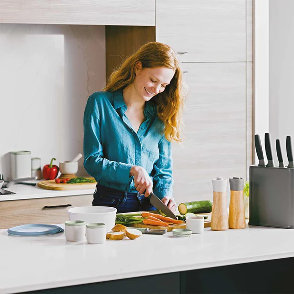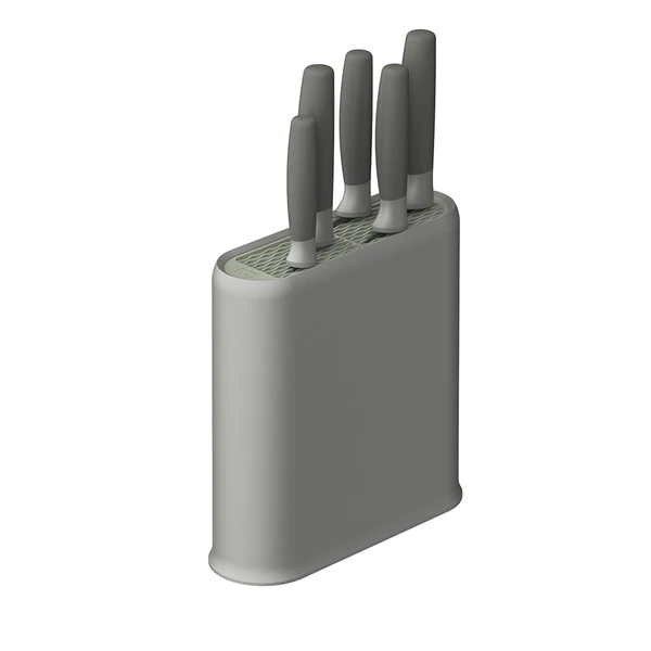 מעמד סכינים אוניברסלי וסט 5 סכינים מסדרת LEO. מעמד סכינים מעוצב בסגנון מינימליסטי המתאים לכל סוג סכין ולכל סוג מטבח. למעמד חלק סיליקוני דו צדדי נשלף, בצבעי אפור וירוק מרווה. ניתן להפוך את החלק הסיליקוני ובכך לבחור את הצבע המועדף עליכם. מכיל עד 8 סכינים ובעל בסיס המונע החלקה ומבטיח אחיזה יציבה על השיש. קל ונוח לניקוי בשל חלקו הנשלף. מגיע עם סט 5 סכיני נירוסטה איכותיים בעלי ידית אחיזה רכה ונוחה לשימוש.