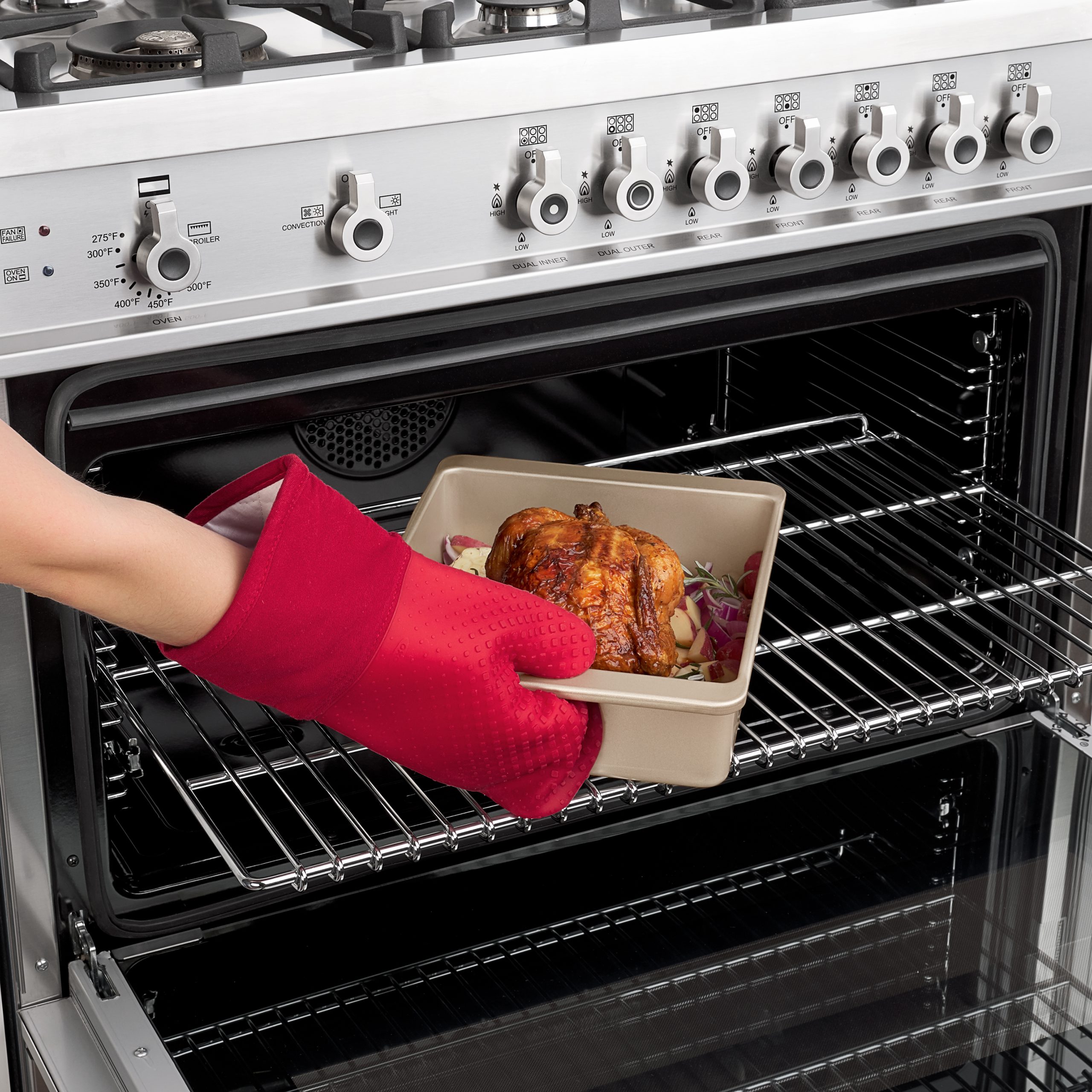דמיינו שיש לכם כפפות של אסטרונאוט שחסינות כמעט נגד כל דבר – זה פחות או יותר התיאור של כפפת הסיליקון האדומה של אוקסו. תחזיקו בבטחה סירים, מחבתות וכל כלי לוהט אחר. גוף הסיליקון בעובי 33 סנטימטר כולל צורת יהלום שמונעת החלקה ובעלת נקודות מגע להגנה כפולה מפני החום.