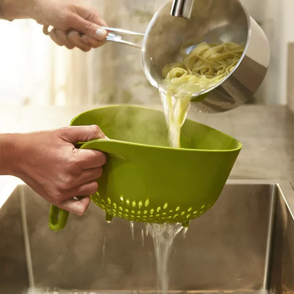 סט 2 מסננות בגדלים שונים, המציעות פתרון פשוט ונוח לסינון המזון. המסננת בנויה בצורה המאפשרת אחיזה נוחה בידית אנכית ומספקת יציבות נוספת כאשר מניחים אותה. המסננות מולבשות אחת על גבי השניה כדי לחסוך מקום באחסון