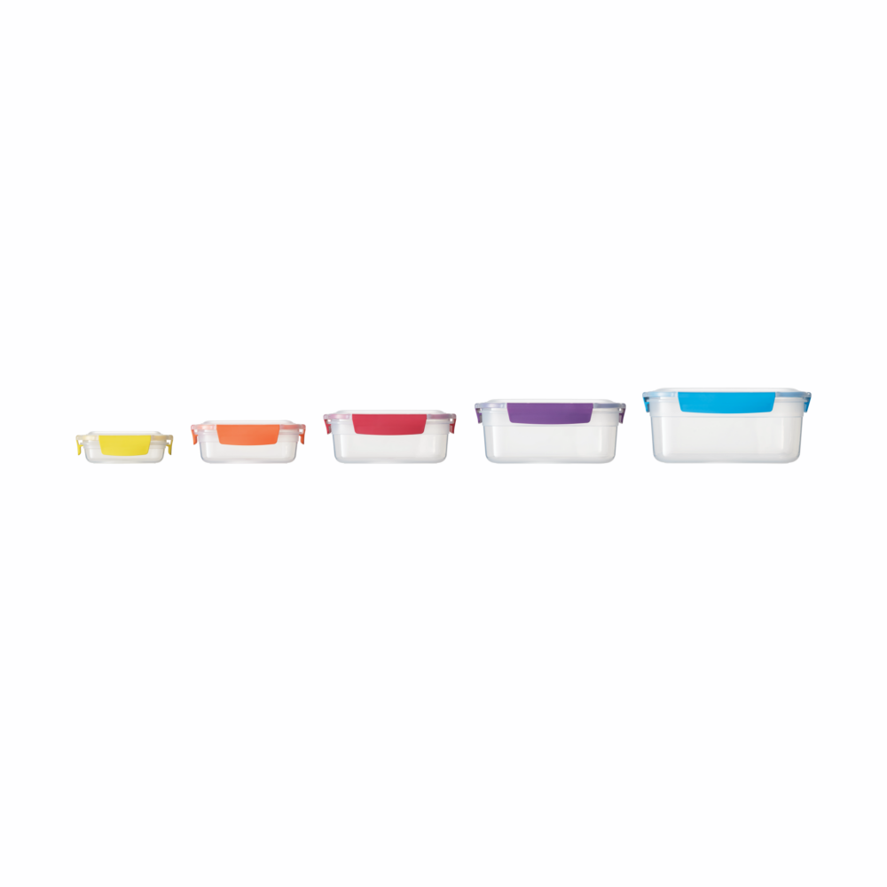 סט הכולל 5 קופסאות אחסון למזון, חסינות בפני נזילות ומתאימות לאחסון במקפיא או במקרר וגם לשימוש מחוץ לבית . הקופסאות ניתנות לאחסון אחת בתוך השנייה ומכסים ניתנים להצמדה זה לזה לאחסון חסכוני במקום ונוח. חומרים: פלסטיק BPA FREE. מידות: 16.3*20*24.5 ס”מ גודל הקופסא הגדולה ביותר. הוראות ניקוי: מתאים למיקרוגל. מתאים לניקוי במדיח כלים