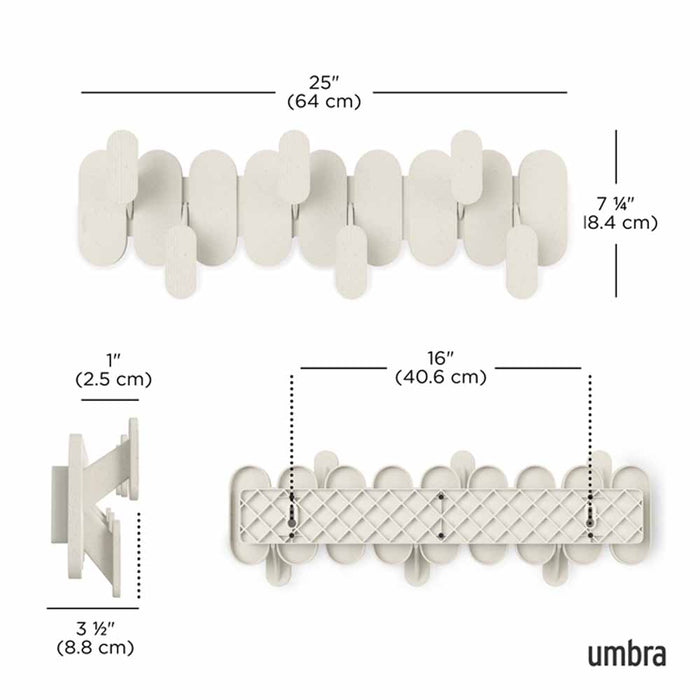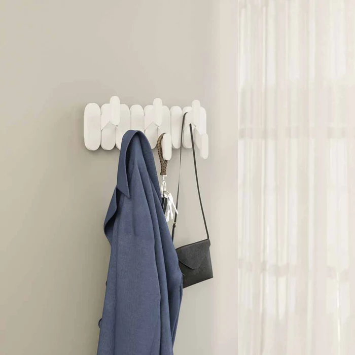 מתלה הקיר Tempo של Umbra בצבע חול משלב עיצוב מודרני עם שימושיות יומיומית – בשורת 6 ווים מדורגים שיוצרים מראה גרפי ונקי על הקיר. הגוון הבהיר והטקסטורה העדינה משתלבים בקלות עם מגוון סגנונות עיצוב, ומושלמים למבואת כניסה, חדר שינה, חדר רחצה או משרד. הווים החזקים מיועדים לתליית מעילים, תיקים, צעיפים, מגבות ועוד, ומסייעים לשמור על הבית מסודר ונעים.